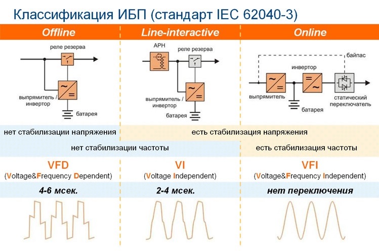 • Оff-line, Standby или резервные: электропитание подаётся одновременно на нагрузочную аппаратуру и на аккумуляторную батарею. Пассивные фильтры отсекают высокоамплитудные скачки напряжения и помехи, а при обесточивании ток подается от аккумулятора. Не годятся ввиду большого времени переключения (4..12 мс) и несинусоидального выходного напряжения (аппроксимация к синусоиде). Хотя просты и дешёвы.