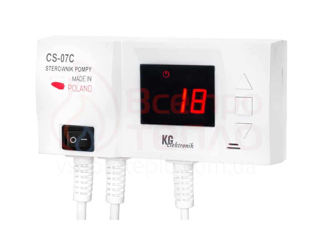 Контроллер KG Elektronik CS-07С управляет насосом тёплого пола или используется как термостат, чтобы выключать или включать насос в системах отопления на твёрдотопливных котах (задаются две температуры при настройке). Простое управление кнопками, возможно включение насоса на постоянную работу, чтобы проверить исправность. Насос включается при достижении заданной пользователем температуры включения (О) отключается при превышении заданной температуры выключения (U).
